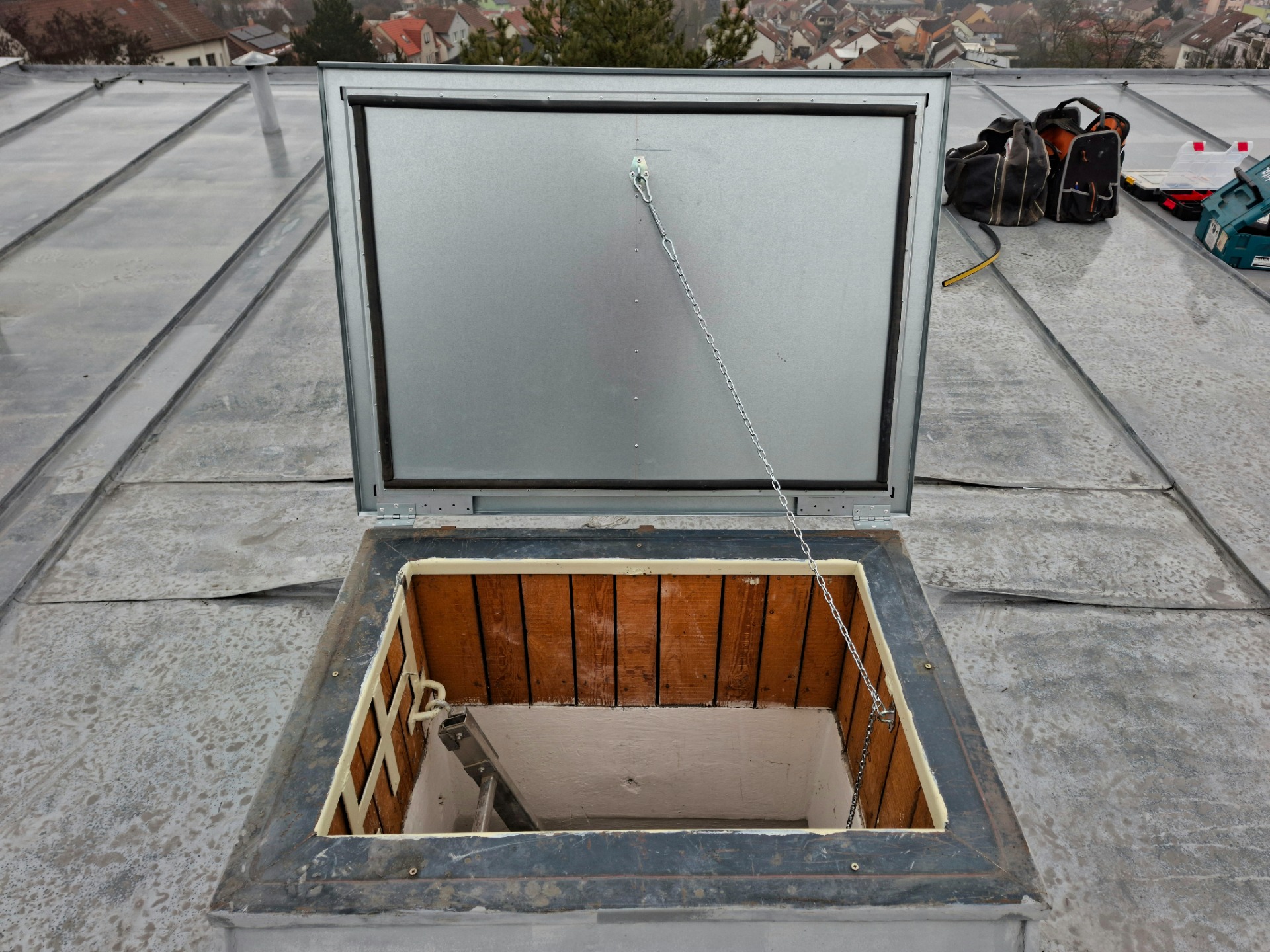 Specializujeme se také na výměnu starých, těžkých střešních poklopů na panelových domech, za námi navržené, nové a lehké poklopy.