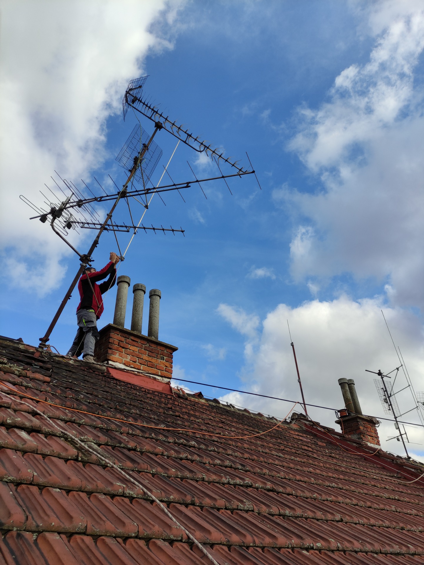 Likvidace různých objektů na střeše. Zde se například likvidovaly staré antény ze střechy panelového domu.